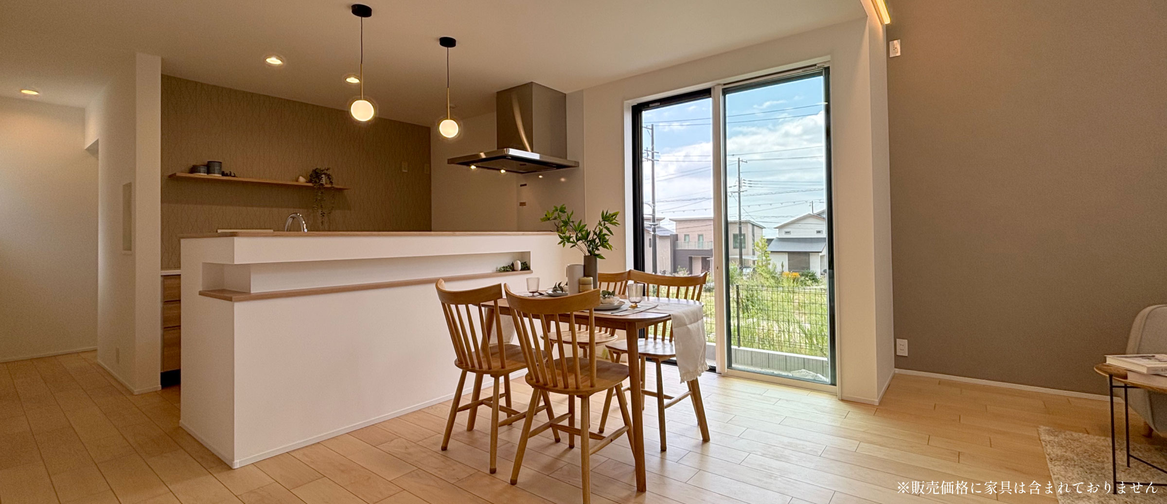 ペンダントライトの柔らかな灯りが、落ち着きある空間を演出。アクセントクロスとも調和し、上品な仕上がりに。